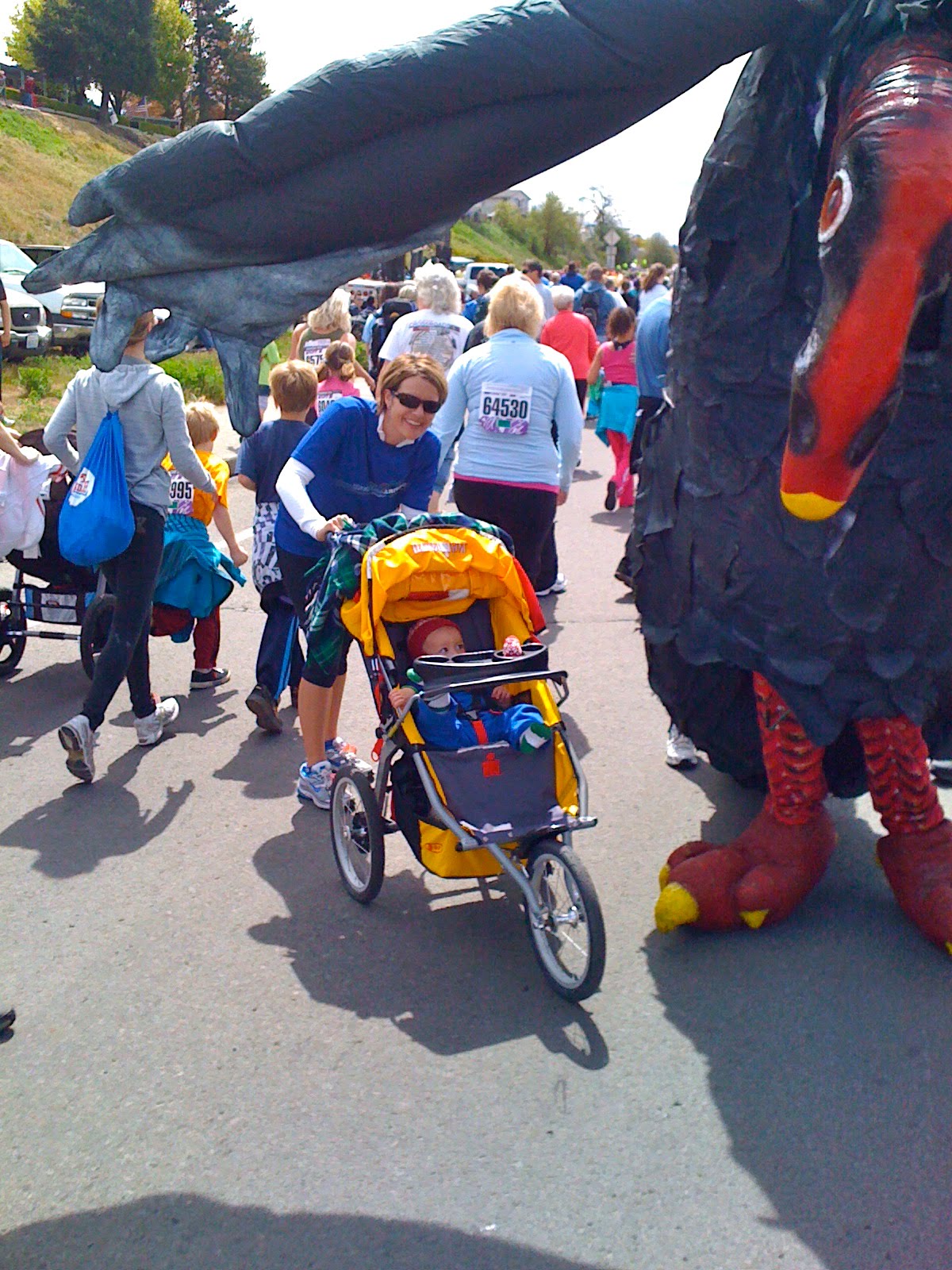 FINISHERS! It was fun, but next year I think we'll volunteer Grandma to be in the stroller section so mom & dad can run together and try to break an hour as a team!